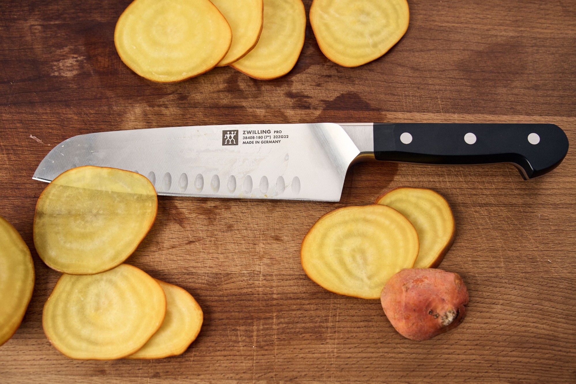 Cutit Santoku, marca Zwilling, lama de 18 cm lungime, cu indentatii, fabricata din otel inoxidabil special, la cele mai inalte standarde, rezistenta la coroziune si socuri.