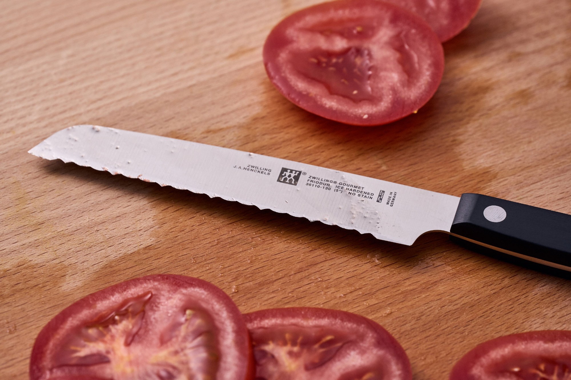 Cutit universal, marca Zwilling, cu lama zimtata de 13 cm lungime, fabricata din otel inoxidabil special, robusta, rezistenta la coroziune si socuri, dar flexibila in acelasi timp.