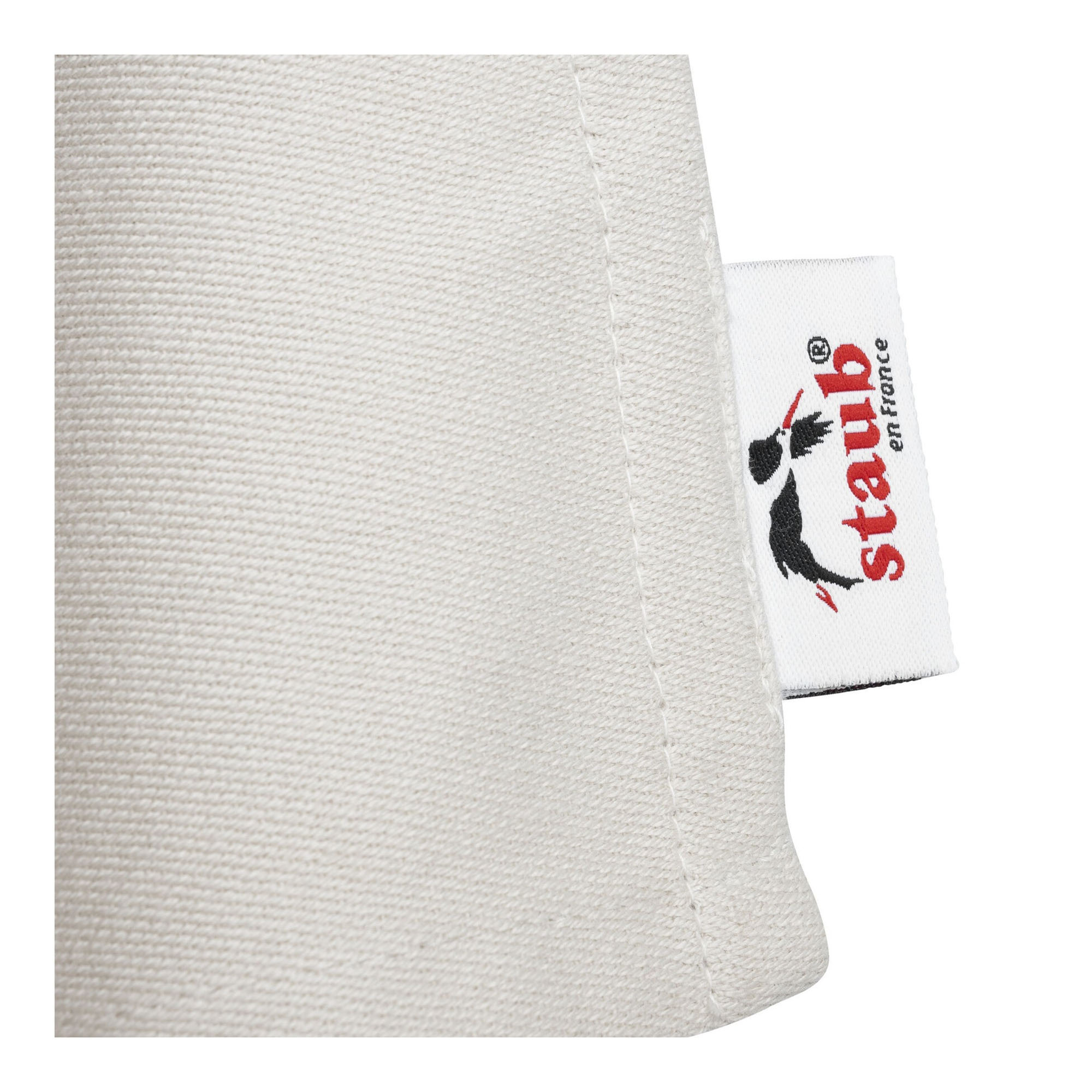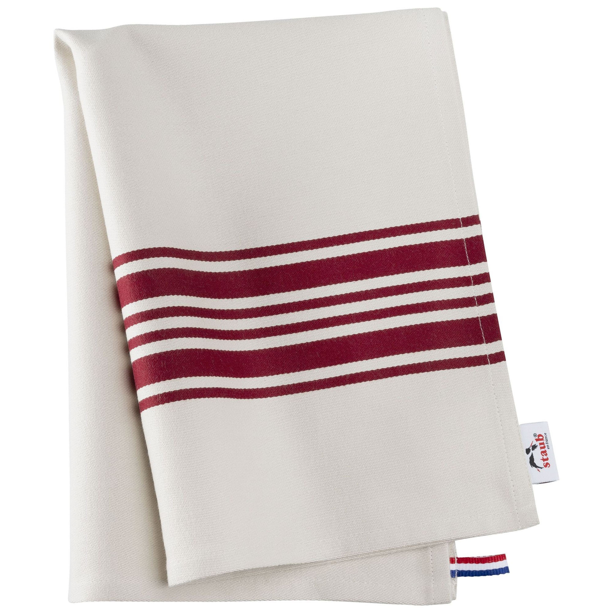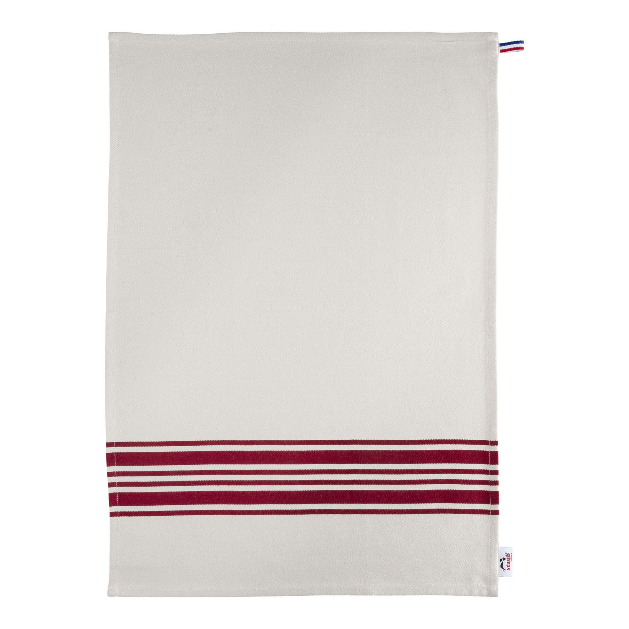 Prosop de bucatarie, marca Staub, confectionat 100% din bumbac, cu dungi rosii, bucla de agatare cu tricolorul Frantei si sigla distinctiva STAUB.