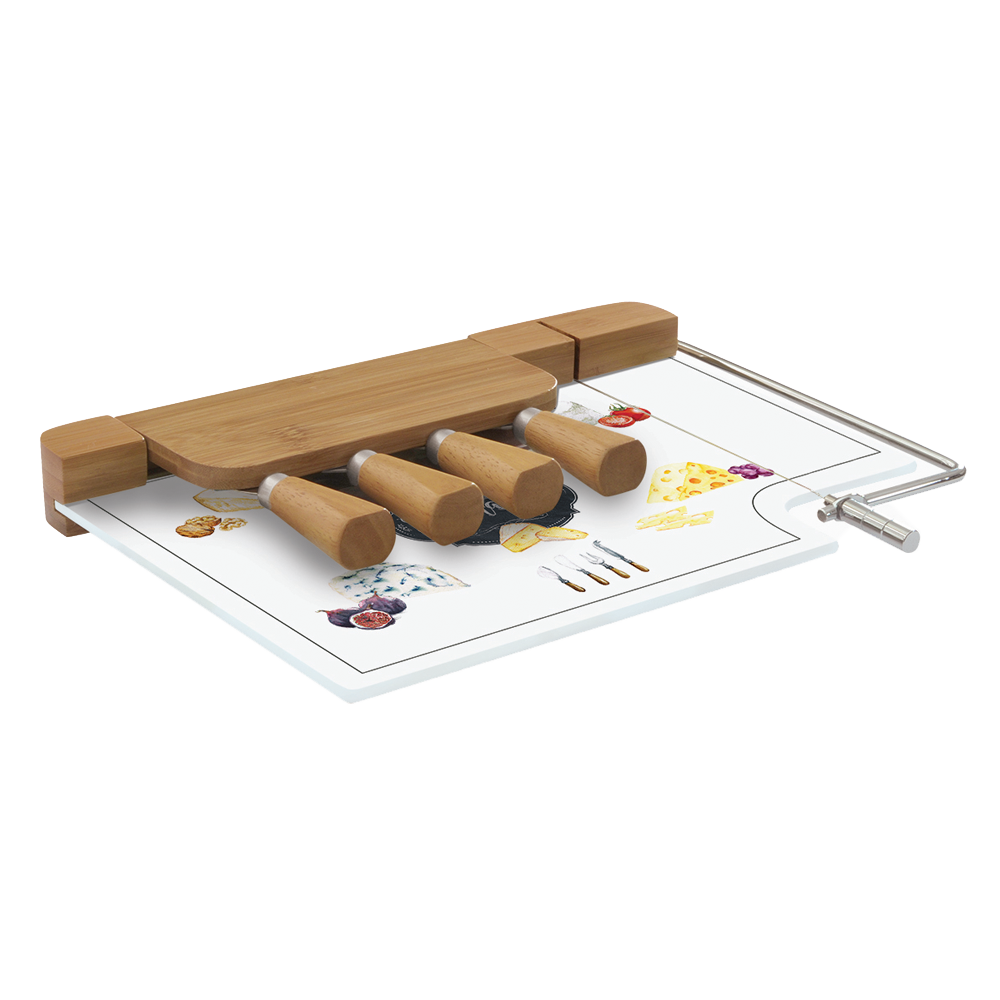 Contine: - 1 blat din sticla cu suport din lemn, pentru taiere, dimensiune: 30,5 x 20 cm. - 1 feliator cu sarma pentru feliere fina - 4 ustensile pentru branzeturi (1 furculita, 2 spatule si 1 cutit).