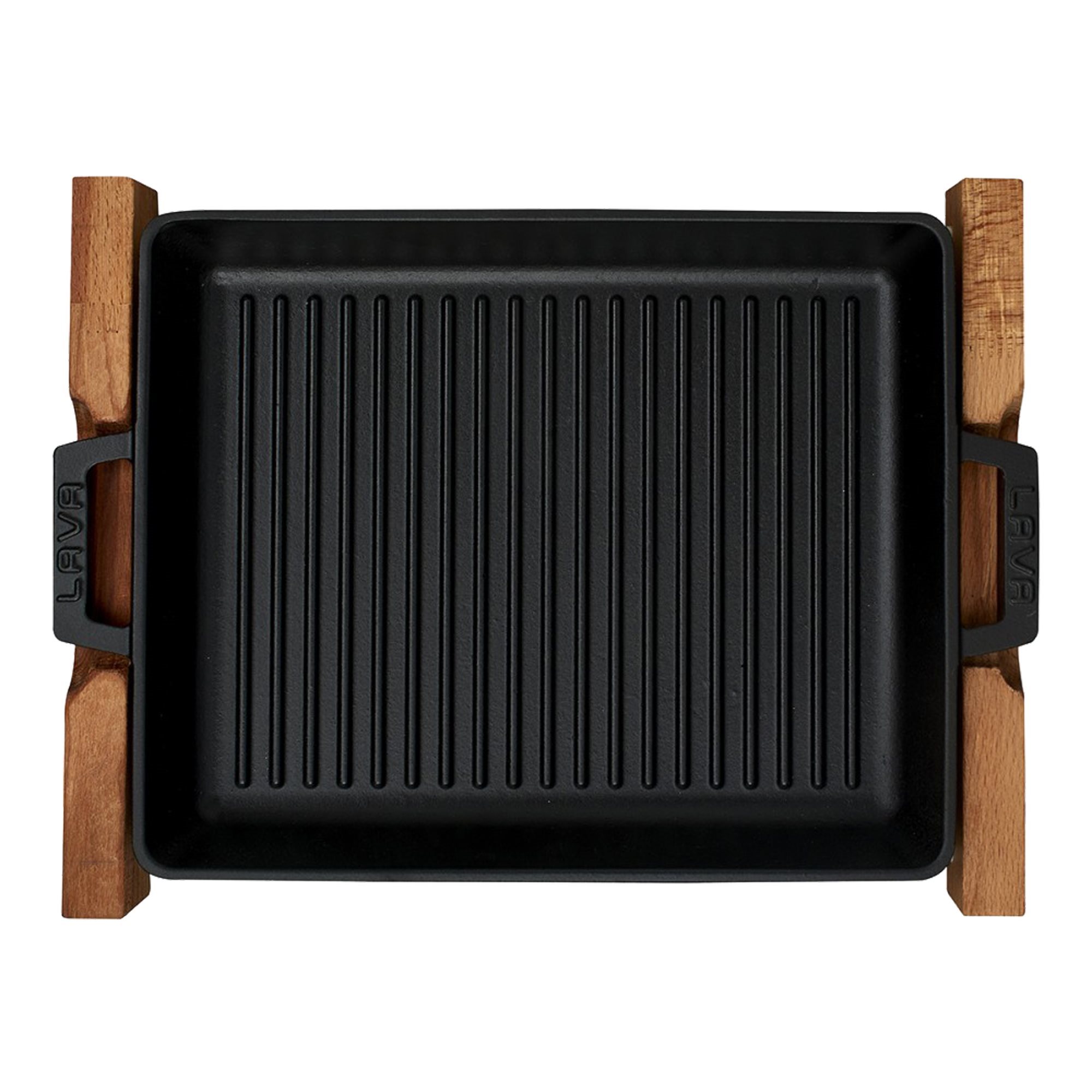 Tava grill cu suport din lemn, marca Lava, dimensiuni 26 x 32 cm, fabricata din fonta.