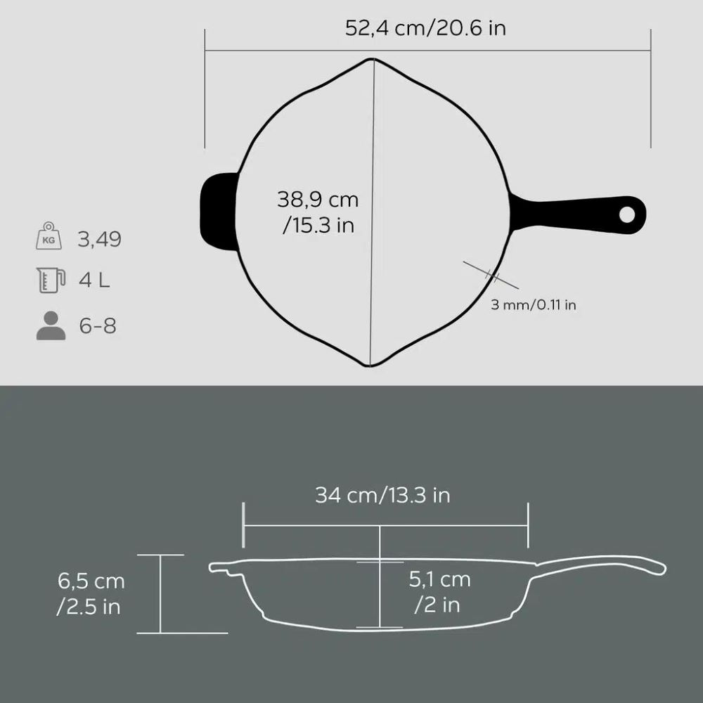 Peretii vasului au o grosime de 3 mm, iar in interior, acesta prezinta un strat de email negru ce faciliteaza crearea unei suprafete antiadezive atunci cand se gateste folosind grasimi.