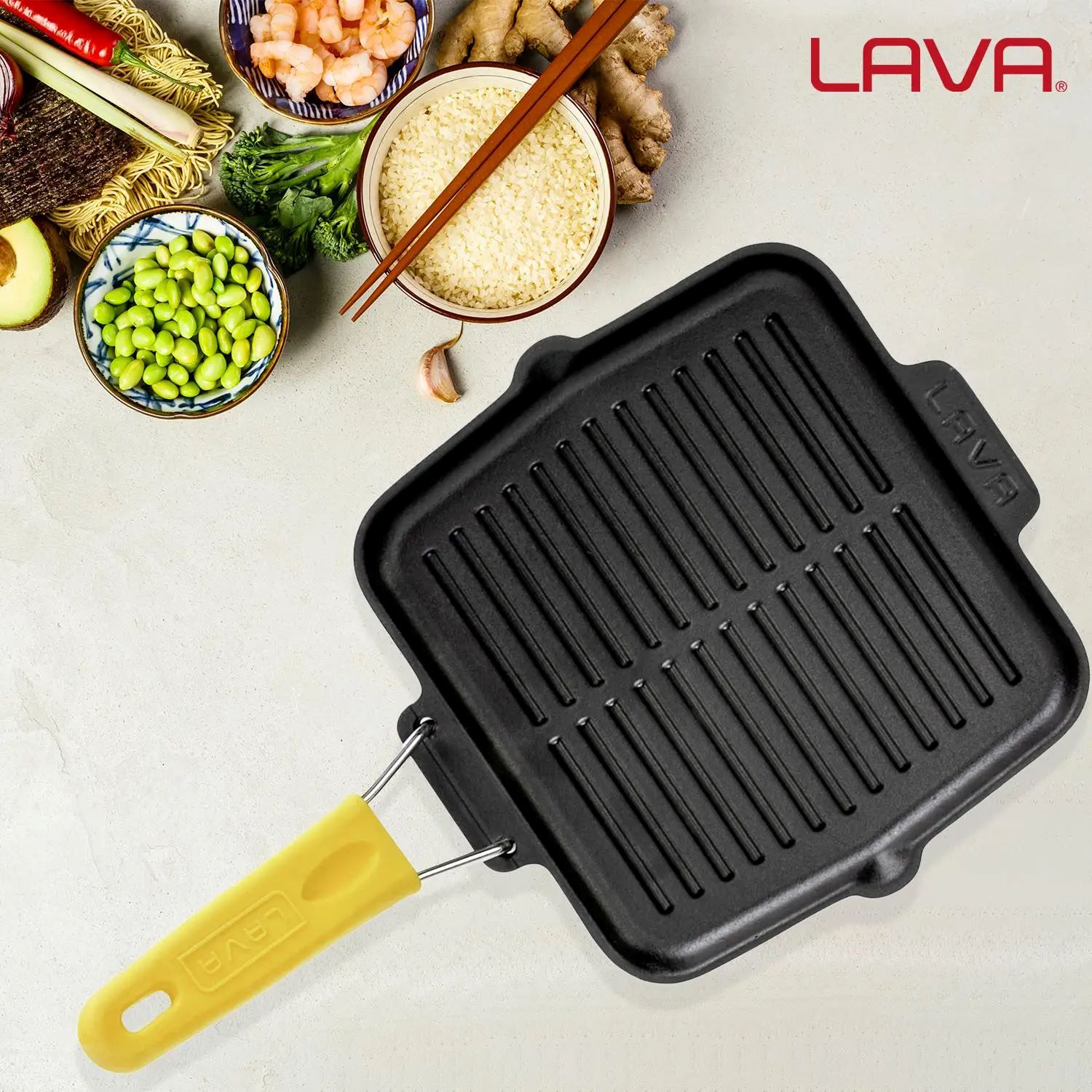 Tigaie Grill patrata, marca Lava, dimensiuni 21 x 21 cm, fabricata din fonta.