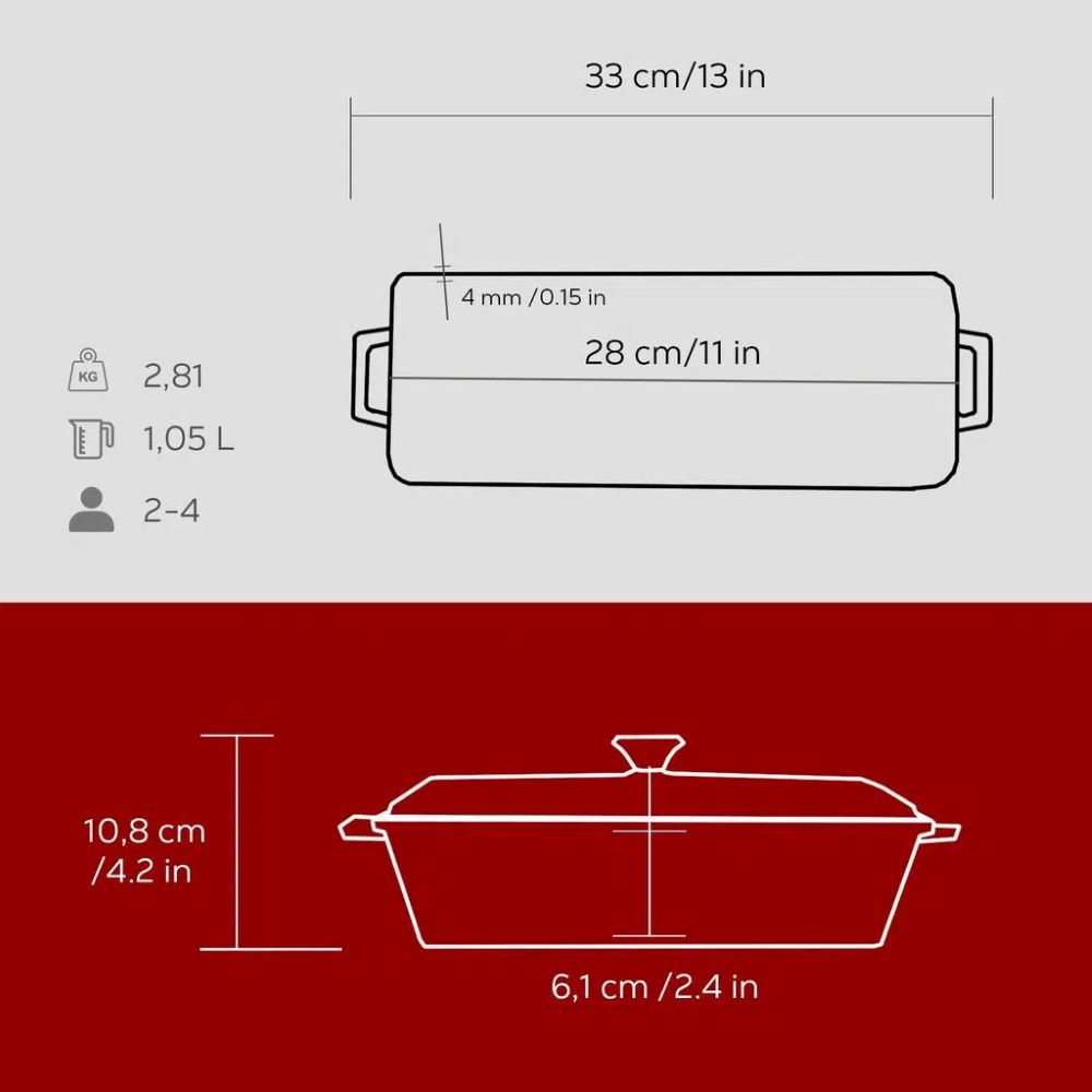 Vas terrine, marca Lava, dimensiuni 8,5 x 26,5 x 6 cm, capacitate 1 L, fabricat din fonta. Poate fi folosit la gatitul legumelor, pestelui si chiar pentru a prepara paine.